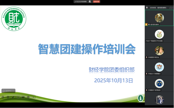 为进一步夯实基层团组织建设,提升各支部副书记的理论素养与实务能力,财经学院团委组织部于2025年10月13日举办了一场线上智慧团建操作培训会。本次会议的培训对象包括财经学院班级团支部副书记和组织部工作人员,旨在明确团支部副书记的工作职责,讲解“智慧团建”系统操作、团日活动组织、团员发展等核心业务,为新学期团务工作的顺利开展奠定坚实基础,确保各项任务有效落实至各团支部。