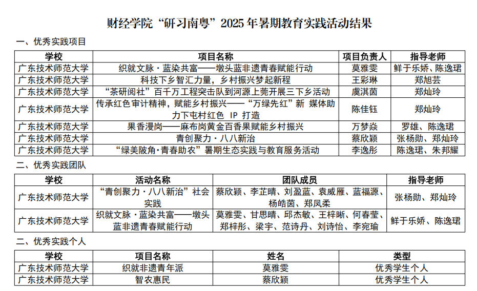 为引导青年学生在社会实践中感悟思想伟力、践行青春使命,根据广东省教育厅《关于开展“研习南粤”2025年大学生暑期教育实践活动的通知》,财经学院积极组织学生参与本年度省级暑期教育实践系列活动。在学校统一部署和学院精心组织下,我院学子表现突出、成果丰硕,共荣获优秀实践项目7项、优秀实践团队2项、优秀实践个人2项,在全省评审中展现出卓越风采。