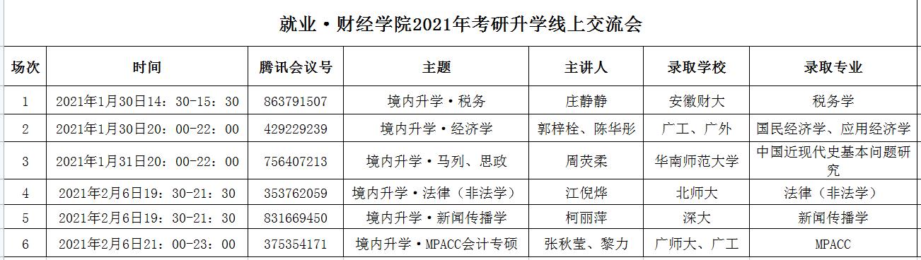 为切实加强学风建设,引导学生充分利用寒假期间科学备考,开展考研动员大会后学院后续指导帮扶工作,财经学院于1月30日-2月6日借助腾讯会议线上平台连续6场开展考研升学经验交流会,交流会面向学院全体学生。