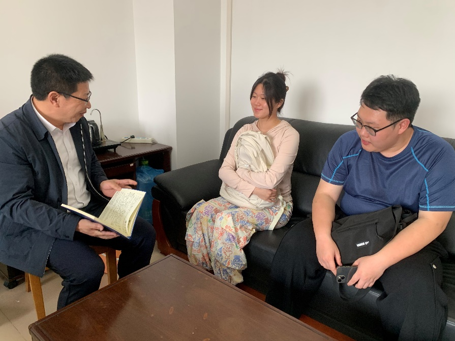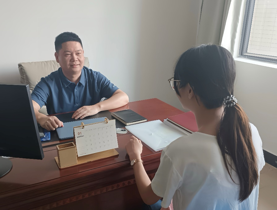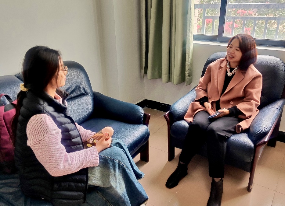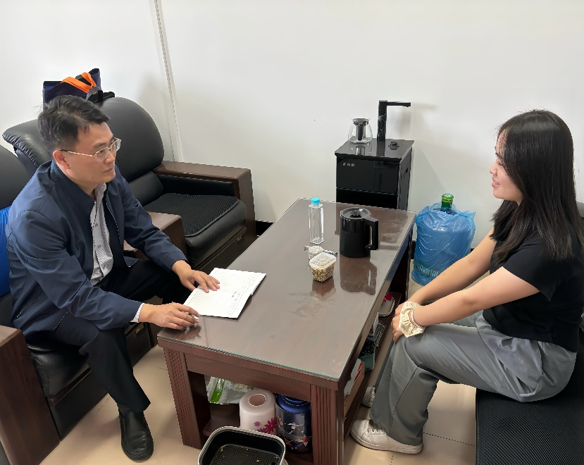 周清副院长与 23级税收 1 班陈燕玲等同学展开谈话。从学习情况入手,针对学生反馈的专业课与非专业课上课情况两极化问题,表示要营造良好班级学习氛围,同学间相互监督。同时建议学生们在校期间提高绩点,参加专业竞赛,寒暑假主动实习,锻炼能力,丰富履历。