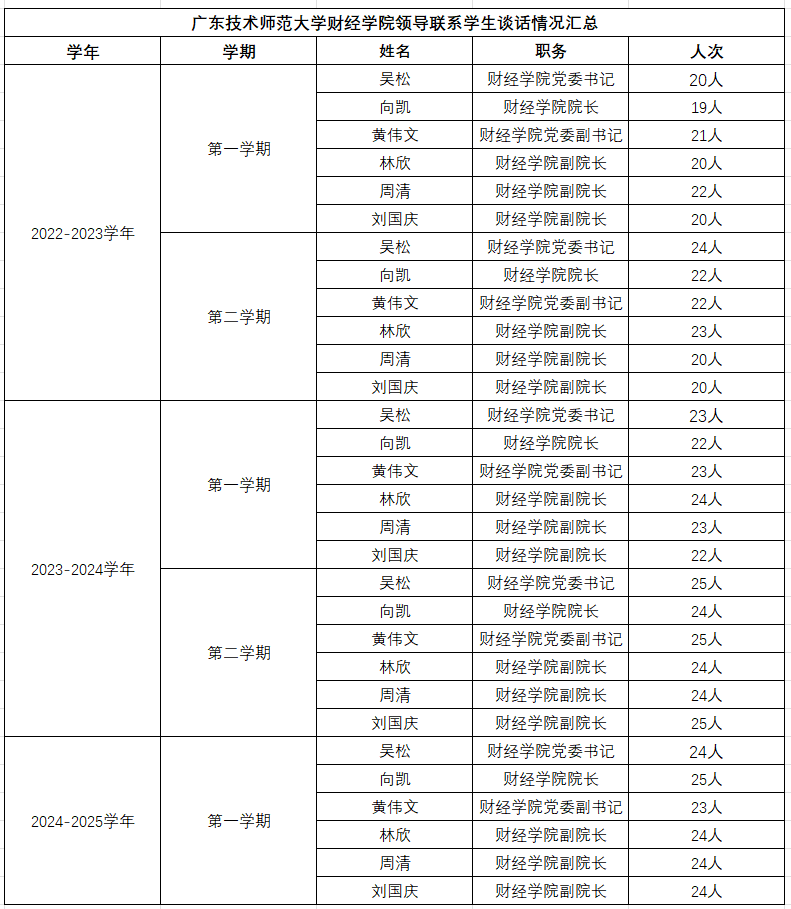 在落实立德树人根本任务的大背景下,财经学院党政领导认真执行《广东技术师范大学领导干部深入基层联系学生工作制度》,始终将 “以生为本”、“以生为目标” 的教育理念融入学院工作的各个环节。学院领导班子高度重视学生的成长与发展,积极推动和扎实落实联系学生工作,深入了解学生需求,切实解决学生困难和困惑,构建全方位育人体系。