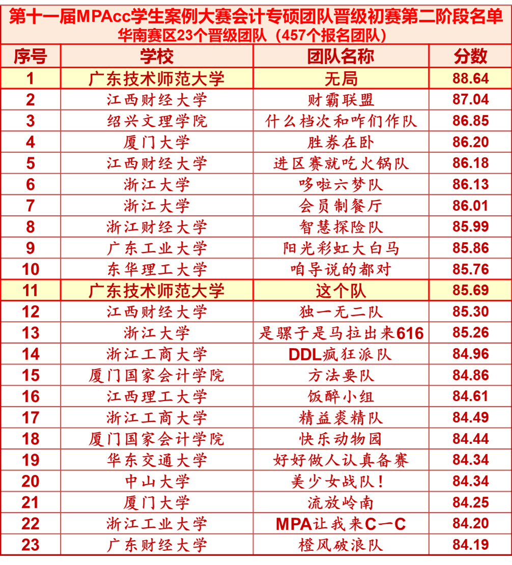 4月25日,2025年(第十一届)中国会计专业硕士(MPAcc)学生案例大赛官网公布了晋级全国第二阶段比赛的名单,财经学院2个MPAcc学生团队表现优异,进入全国百强。其中,一个学生团队比赛成绩在全国338所MPAcc培养单位共计3173个参赛团队中排名第1名,在457个参赛团队的华南赛区排名第1名。我校再次蝉联广东省内高校第1名,创造了我校会计专硕学生参赛以来最好的成绩,再次实现了历史性的突破。
