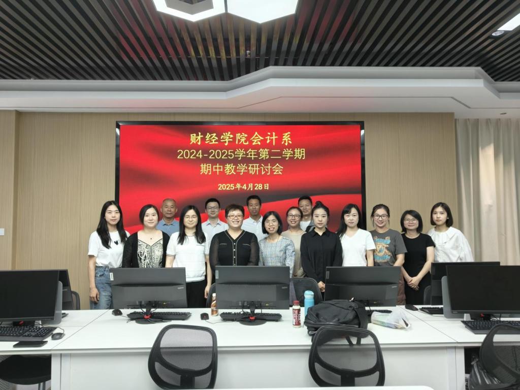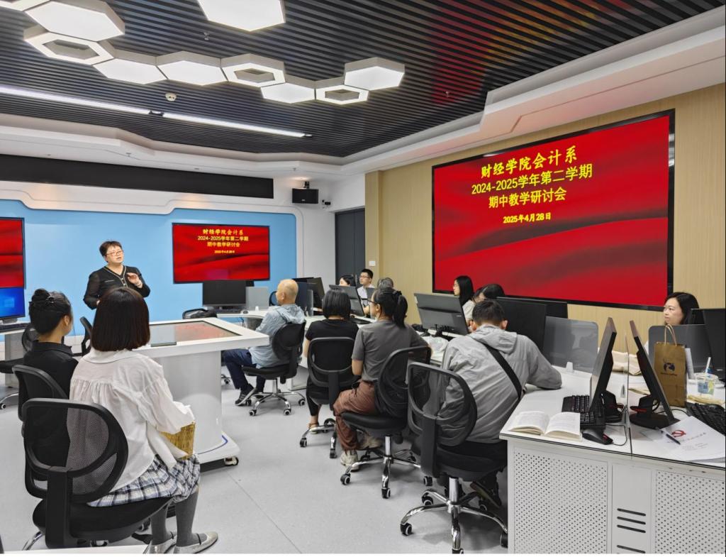 2025年4月28 日中午 13:30,会计系在第三实训楼503召开系教学研讨会。会议首先由蔡军教授首先总结开学初档案检查情况,大部分老师档案规范,分值合理,批改认真。但个别老师个别老师课程目标达成度分析还存在问题。要求老师们要自查整改,将工作做到实处。系副主任曾诗韵老师对毕业论文工作做出安排,并且解答了大家有关实习工作平台校友邦的问题,提醒老师们按时提交定稿与评阅论文。