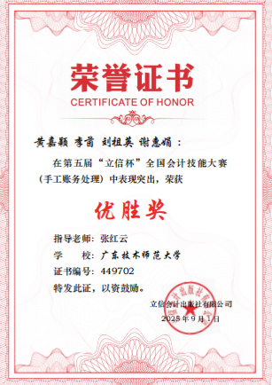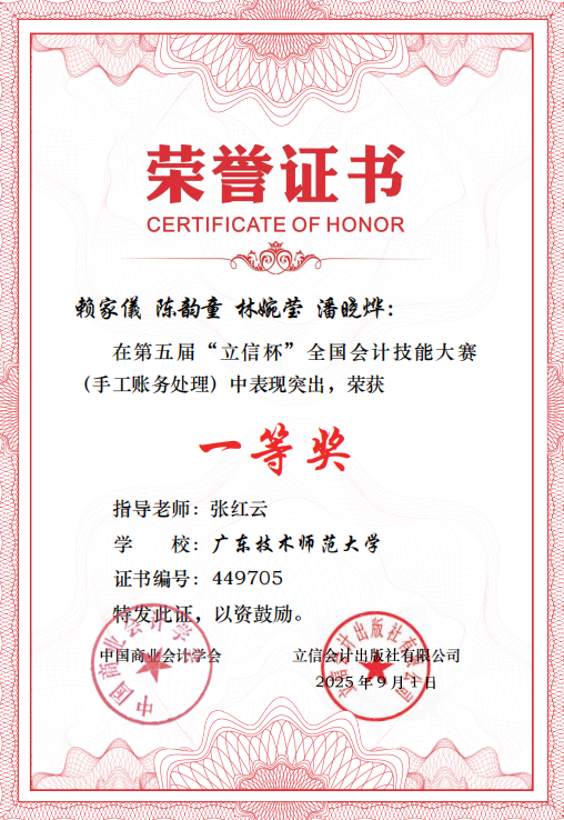 近日,由中国商业会计学会主办的第五届“立信杯”全国会计技能大赛(手工账务处理)全国总决赛获奖名单正式公布。我院五支参赛队伍的参赛作品全部获奖,分别荣获一等奖1项、二等奖1项、优胜奖3项,充分展现了财经学院在会计实践教学方面的显著成效。
