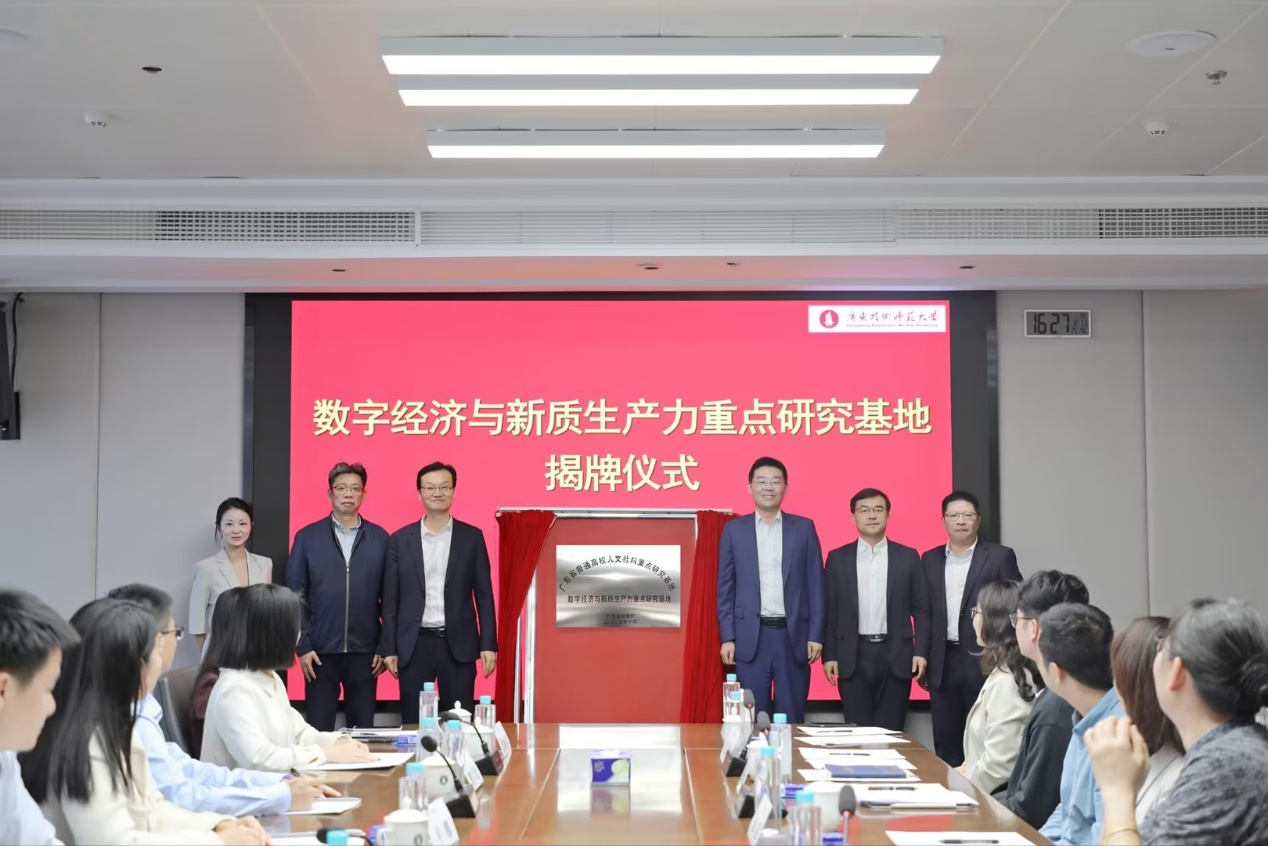 在与会嘉宾的共同见证下,基地主任王兵书记,基地副主任蔡君副校长和向凯院长,与南方财经全媒体集团胡智勇书记、杨云飞副书记、陈晨总监,共同为“数字经济与新质生产力重点研究基地”揭牌。
