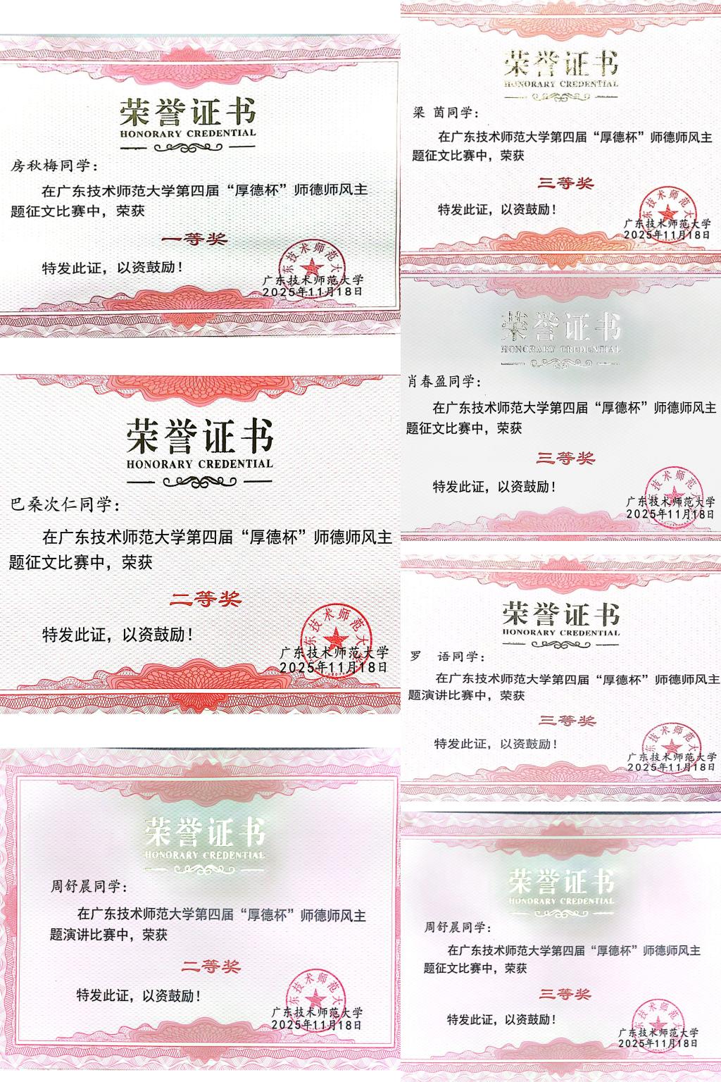 在各赛道的角逐中,学院师生凭借扎实功底与深刻师德理解斩获佳绩。教师组方面,吴松、陈逸珺老师合作的《以德树人,薪火相传——弘扬教育精神之风,铸就教育强国之魂》获师德微视频三等奖;陈逸珺老师的《教师何为,学生何好:师德视野下的辅导员角色再思考》获师德征文三等奖。学生组方面,征文赛道中,房秋梅同学《师者“仁爱”:照亮学生成长的那束光》获一等奖,巴桑次仁同学《以德为炬,照亮成长路》获二等奖,肖春盈同学《以青春之名,铸教育之魂》、梁茵同学《当“Z 世代”师范生日遇师德:在多元价值观中锚定教育初心》、周舒晨同学《厚道载物,师道永续》获得三等奖;演讲赛道中,周舒晨同学《承师者风范,谱青春诗篇》获二等奖,罗语同学《一句普通话,一个世界的链接》获三等奖。