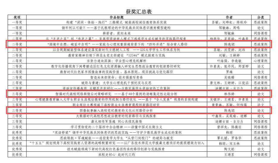 在此次评选中,财经学院教师表现突出,共获得3项省级奖项。其中,陈逸珺老师荣获思想政治工作案例二等奖、论文三等奖;林伟婷老师荣获思想政治工作论文三等奖。