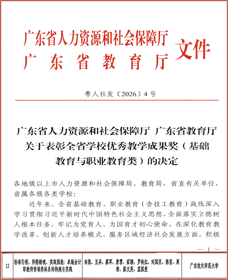 近日,广东省人力资源和社会保障厅、广东省教育厅联合印发《关于表彰全省学校优秀教学成果奖(基础教育与职业教育类)的决定》(粤人社发〔2026〕4号)。其中,财经学院院长向凯教授团队申报的《标准引领、师德铸魂、实践强能:卓越会计职教师范生培养模式的探索与实践》(团队成员:向凯、王兵、蔡军、唐霏、茹璟、罗映红、刘国庆、陈芸、周清、蔡文英、蓝国爱)荣获2025年全省学校优秀教学成果奖(职业教育)特等奖,实现了学校及财经学院办学以来在省级职业教育教学成果奖特等奖上的零突破。