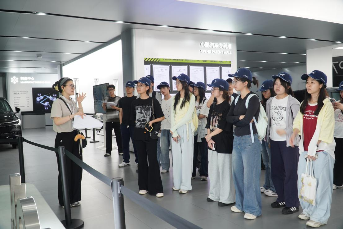 研学队伍走进小鹏广州生产基地展厅。在讲解员的细致引领下,同学们通过图文展板、实物陈列与动态讲解,系统了解中国汽车工业的发展历程,近距离感受智能制造领域的前沿技术与创新成就。展厅中,从中国汽车工业的起步突破到如今在智能网联、新能源汽车领域的跨越式发展,一组组数据、一件件成果,不仅让同学们直观感受到国家制造业的强劲实力,更激发了大家的探究兴趣与爱国情怀,现场不时传来阵阵赞叹,大家纷纷驻足记录,深刻体会到科技进步与产业发展的强大力量。