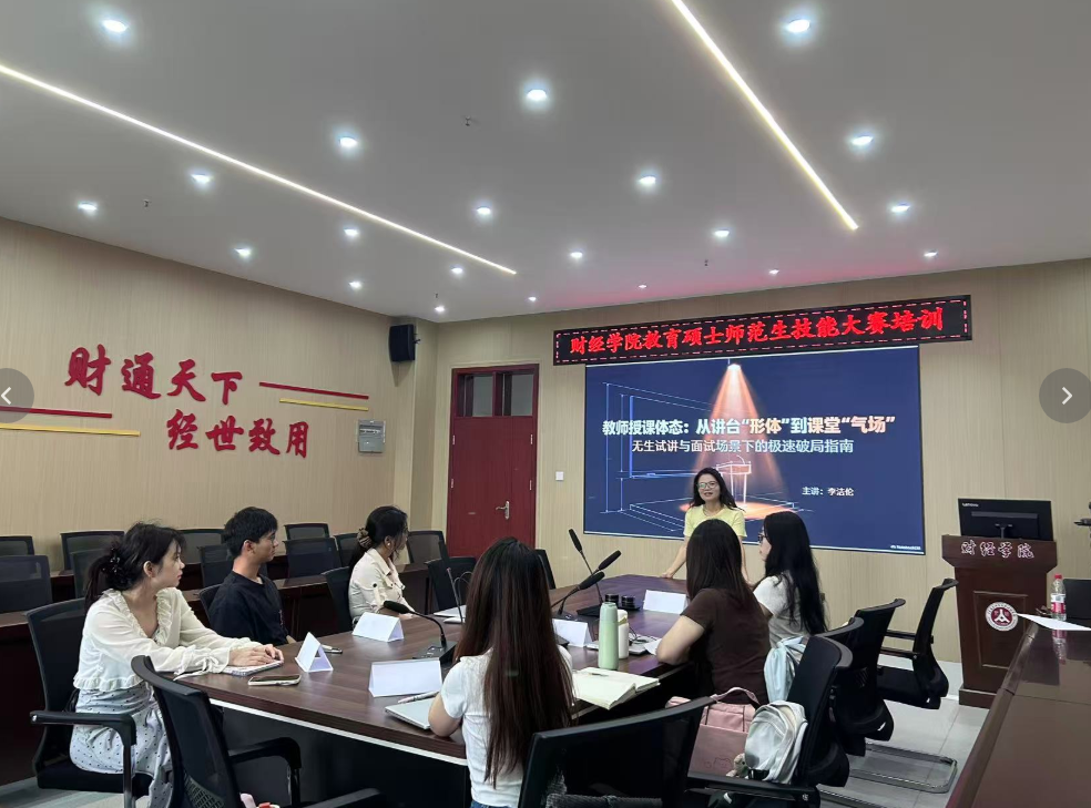 为进一步贯彻落实研究生院关于教育硕士培养“以赛促学、以赛促训、以赛砺学”的工作要求,全面提升职业教育(财经商贸)方向研究生的教育教学实践能力与专业综合素养,并为全国“田家炳杯”教学技能大赛选拔、储备优秀种子选手,财经学院启动2026年全日制教育硕士教学技能竞赛系列培训。4月14日,专题培训辅导会,由学院罗映红教授与李洁伦老师联袂主讲,分别聚焦大赛细则解读与现场说课专项打磨。